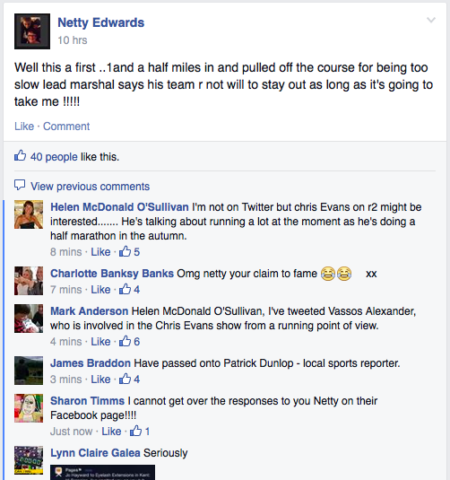 If you were lurking on twitter or Facebook last night, you might have seen a furore kicking off about the Spen 20 race. According to her account, a lady called Netty was pulled off the course by a marshal after a mile and a half, who told her she was too slow (she was, at that very early point, doing around 12 minutes a mile) and that the race “wasn’t for people like her”.
